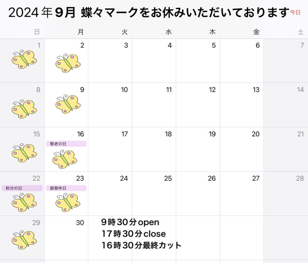 9月のご予約は全て埋まりました。いつもご予定を立てて頂き本当にありがとうございます!